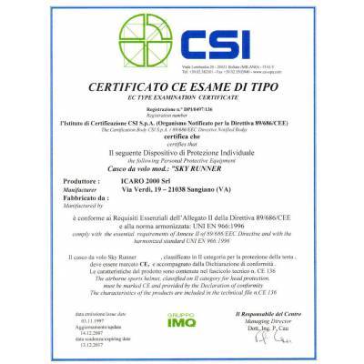 All ICARO helmets have been tested and certified by CSI, a company authorized by the Italian Ministry of Transport and recognized by the German organization TUV.